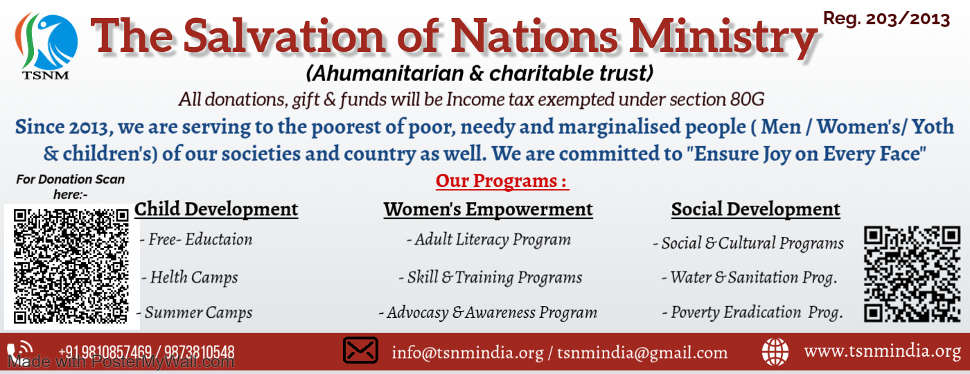 The Salvation of Nations Ministry, TSNM is a humanitarian non-government organization which was founded in year 2013; it is a social development charitable NGOs. As of august 2019 we are working in two states of India. We are committed to the society and serving the downtrodden, needy, marginalized and deprived people of the societies and helping them to live their life with respect and dignity. We have made our impact on thousands of men/women’s and children’s. The Salvation of Nations Ministry believes that every single human deserve the joyful life with honor and respect and that’s why we are fiercely committed toward “ensuring joy on every face” of the people. Read more...